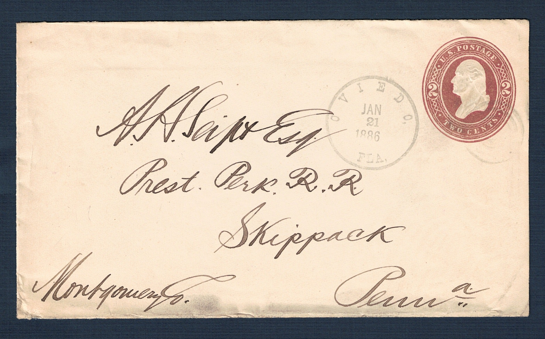 The earliest single circle postmark with quad circle "killer" cancel, OVIEDO, FLA, JAN 21 1886, on a cover to A. H. Seipt Esq. Prest Perk R.R., Skippack, Penna, Montgomery Co. (Scott U277, Design U67, Die U45.)