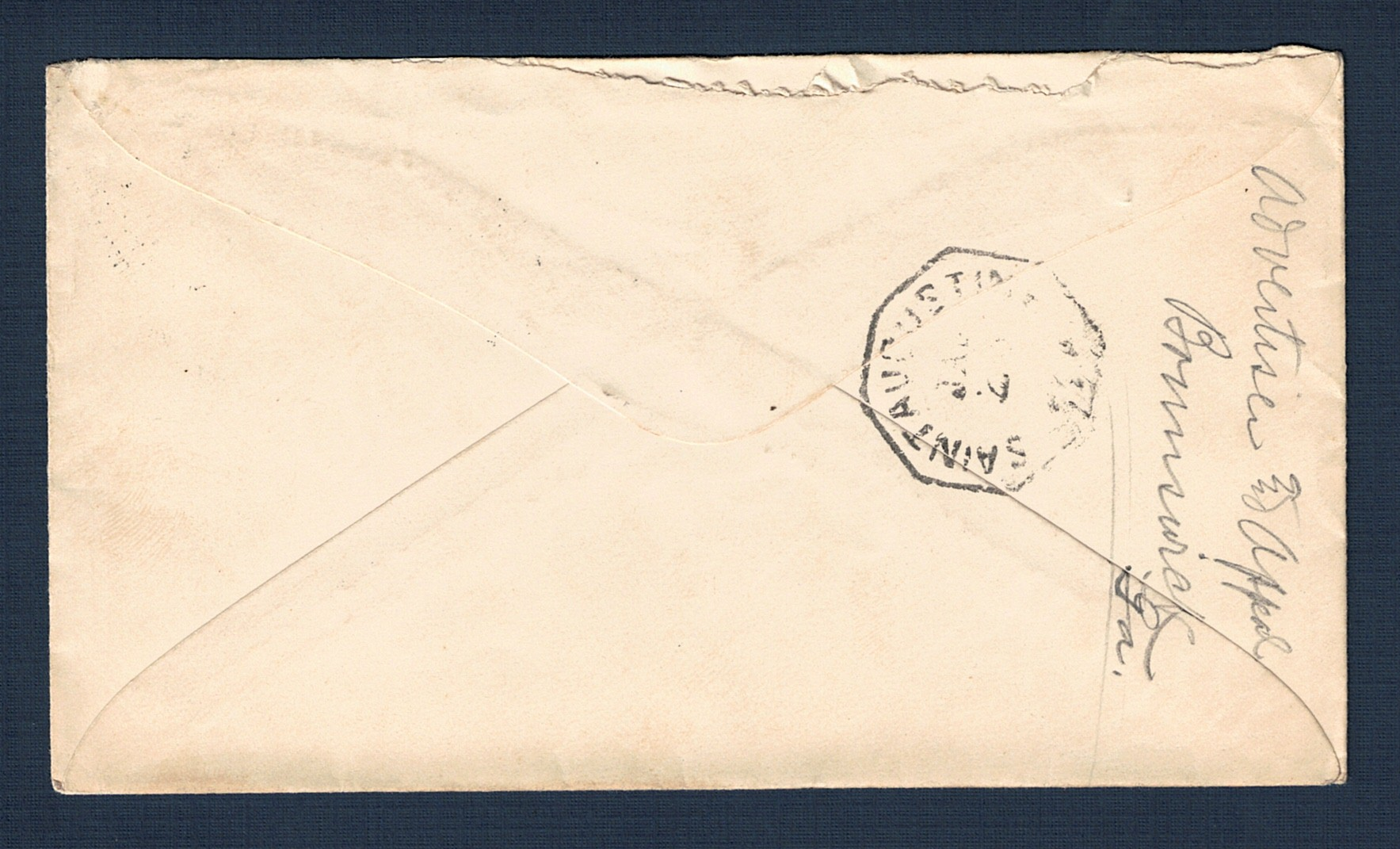 The octagonal SAINT AUGUSTINE FLA, JAN 23 is interesting in the this cover traveled a little north before it turned around and traveled south to Oviedo. Because the transit mark is at St. Augustine, which is on the St. Johns river, this cover probably traveled by steamer to Lake Jesup, then to Oviedo.