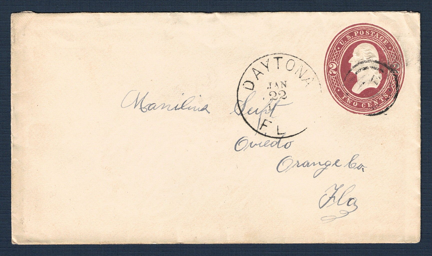 DAYTONA, FLA, JAN 22 1886, on a cover to Manilius Seifel. Oviedo, Orange Co., Fla. (Scott U277, Design U67, Die U45.)